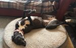 Mini is a very sweet, happy pretty girl. Good with kids of all age. She is playful and gives kisses. She gets along well with other greyhounds. She likes to steal your shoes just to bring them on her dog bed. She is really good in her crate and sleeps all night